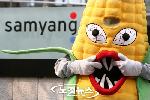 [BestNocut_R]서울환경운동연합과 소비자시민모임 회원들이 10일 오전 서울 종로구 연지동 삼양제넥스 본사 앞에서 가진 GMO(유전자조작) 옥수수 수입 철회 요청 2차 기자회견에서 한 회원이 옥수수 인형을 쓰고 위험성을 표현하고 있다.