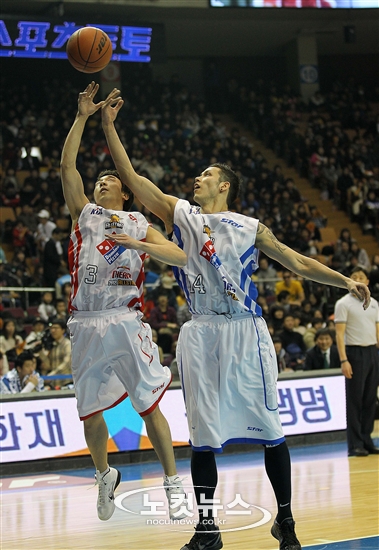 29일 오후 서울 잠실실내체육관에서 열린 ‘2012 KB국민카드 프로농구 올스타전’ 에서 드림팀의 김현중 선수와 매직팀의 이승준 선수와 공을 다투고 있다.