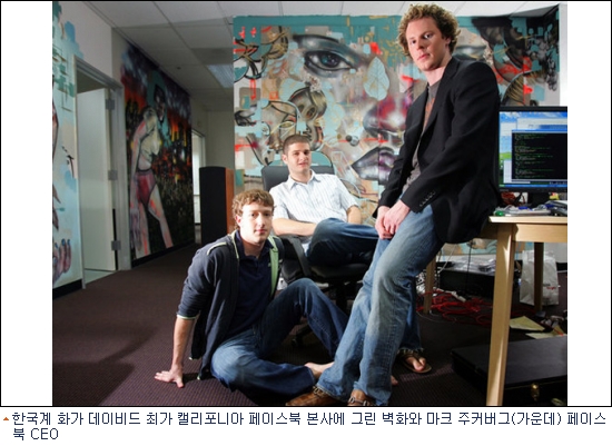 뉴욕타임즈는 3일 한인 화가 데이비드 최(35)씨가 페이스북 건물에 벽화를 그려주고 대가로 돈 대신 페이스북 주식을 받았다고 보도했다. 올해 말 페이스북의 주식이 상장될 경우 그가 얻을 평가차익이 2억 달러(약 2240억원)에 달한다며 그의 선택이 매우 현명했다고 덧붙였다.