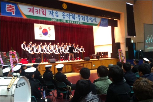 셔플댄스에 앞서 계룡대 육군 지원대가 난타 공연을, 1학년 학생들이 합창과 율동을 선보이면서 분위기는 후끈 달아올랐다. 이른바 '작은 음악회와 함께 하는 졸업식'.