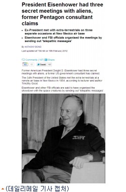 데일리메일은 '지난 2010년 공개된 국방부 기밀문서에 따르면 영국 윈스턴 처칠이 영국 동부해안에서 정찰 중이던 영국 공군에 의해 발견된 UFO에 대해 기밀유지를 지시했다'며 '처칠은 아이젠하워와 UFO 처리에 대해 논의한 것으로 알려졌다'고 전했다.[BestNocut_R]