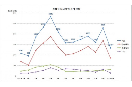 지난달에만 학교폭력으로 검거된 가해학생은 모두 1349명으로 12명이 구속됐다. 이 가운데 단순폭력은 867명(구속 8명), 금품갈취는 326명(구속 4명) 이었다.