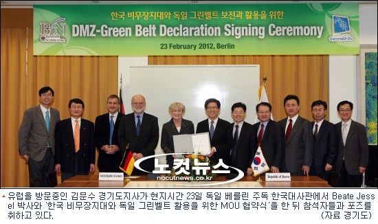 독일을 방문중인 김문수 경기지사는 현지시간 23일 베를린의 독일주재 한국대사관에서 독일연방 자연보전청(BfN-Bundesamt fuer Naturschutz)의 베아테 예쎌 자연보전청장과 ‘경기도-독일자연보전청 DMZ보존활용 양해각서체결식’을 가졌다.