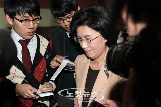 새누리당 진수희 의원이 5일 오후 여의도 당사에서 자신의 지역구인 서울 성동갑이 당의 전략공천 지역으로 지정된 데 대해 반발 기자회견 후 당사를 빠져나가고 있다.