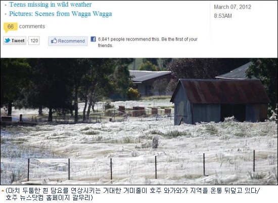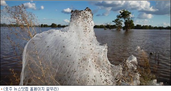 호주 뉴스닷컴(www.news.com.au)은 최근 160년 만에 대홍수를 겪고 있는 호주 뉴사우스 웨일스주 와가와가지역에 수백만 마리의 거미들이 몰려들어 부지런히 거미줄을 치고 있다고 보도했다.