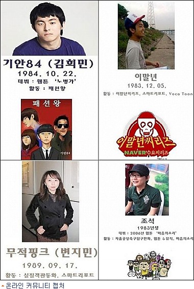 인기 절정의 웹툰 ‘패션왕’의 기안74(김희민), ‘마음의소리’의 조석, ‘와라! 편의점’의 지강민, ‘이말년 씨리즈’의 이말년, 실질객관동화의 무적핑크(변지민)의 얼굴이 그 주인공이다.
