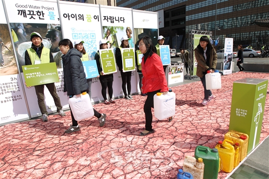 물 부족과 수질 오염 문제를 해결하기 위해 제정된 '세계 물의 날'을 하루 앞둔 21일 오전 서울 광화문 광장에서 굿네이버스 자원봉사자들이 물통을 들고 걷는 퍼포먼스를 하고 있다.