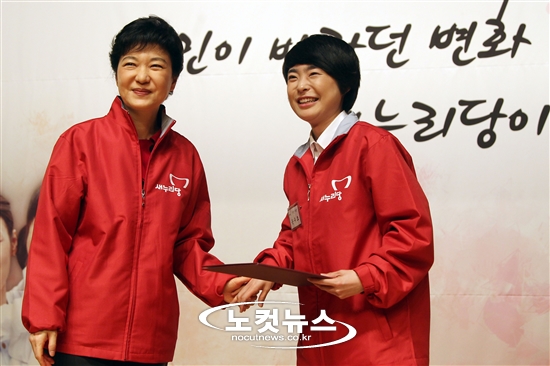 부산 사상에 출마하는 손수조 후보가 21일 오전 서울 여의도 국회 의원회관에서 열린 '새누리당 총선 중앙선대위 발대식 및 공천장 수여식'에서 박근혜 대표로부터 공천장을 건네받은 후 함께 웃음짓고 있다.