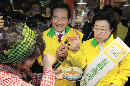 민주통합당 한명숙 대표가 29일 오후 정세균 종로 후보의 지지 유세차 서울 종로구 통인시장을 방문해 시민들이 주는 비빔밥을 먹고 있다.