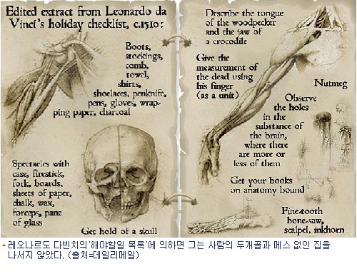 목록을 보면, 레오나르도는 1510년 자신의 해부학 책을 위해 두개골을 획득해야 한다고 적었다. 화가인 그는 또 분필과 목탄연필 그리고 종이를 사야 한다고도 기록했다.