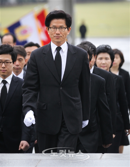 대선출마 의사를 밝힌 김문수 경기도지사가 22일 오전 서울 국립 현충원을 방문한 가운데 수행원들과 함께 참배를 위해 입장하고 있다.