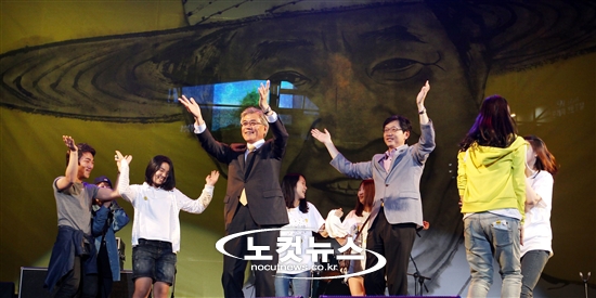노무현 전 대통령 서거 3주기를 나흘 앞둔 19일 오후 서울시청 앞 광장에서 열린 추모문화제에서 문재인 민주통합당 당선자가 영화 '써니'의 ost인 Boney M의 'Sunny'곡에 맞춰 춤을 추고 있다.