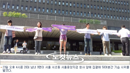 23일 오후4시쯤 대학생으로 보이는 20대 남녀 9명이 서울 서초동 서울중앙지검 청사 앞에 집결해 50여분간 기습시위를 벌였다.