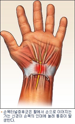 수근관증후군으로 불리는 손목터널증후군은 팔에서 손으로 이어지는 가는 신경이 손목의 인대에 눌려 손이 저리거나 감각이 둔해지고 통증이 발생하는 질환이다. 통증은 주로 2, 3, 4번째 손가락에서 발생한다.