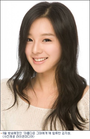 김지원은 오는 8월 첫 방송 될 SBS 새수목드라마 ‘아름다운 그대에게’(극본 이영철, 연출 전기상)에서 스타급 체조선수 설한나 역을 맡아 ‘국민여동생’으로 변신한다. MBC 시트콤 ‘하이킥! 짧은 다리의 역습’에서 호흡을 맞춘 이영철 작가와는 3개월 만에 재회하게 됐다.