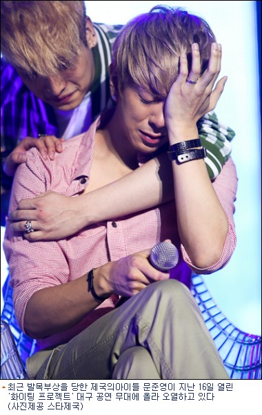 문준영은 지난 16일 대구 코오롱 야외음악당에서 열린 제국의아이들 컴백 ‘화이팅 프로젝트’ 대구 지역 공연 무대에 깜짝 등장했다. 지난달 말 한 방송프로그램 녹화에서 다리 부상을 당했던 그의 등장에 공연장에 모인 8천여 명의 팬들은 환호했다.