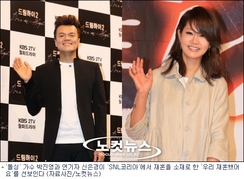 가수 박진영과 연기자 신은경이 tv 프로그램에서 파격적인 콩트쇼에 나선다. 신은경은 30일 방송되는 케이블 채널 tvN 'SNL코리아'에 카메오로 출연, 이날 호스트 박진영과 함께 ‘우리 결혼했어요’를 패러디한 '우리 재혼했어요'편에서 재혼 콘셉트의 콩트 연기를 선보인다.
