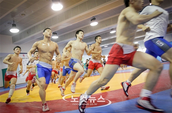 대한민국 레슬링 국가대표팀이 4일 오전 서울 태릉선수촌 레슬링장에서 미디어데이를 연 가운데 선수들이 몸을 풀고 있다.