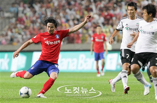 5일 오후 서울 상암월드컵경기장에서 열린 '2002 월드컵 대표팀 초청 K리그 올스타전'에서 TEAM 2012가 6-3으로 승리했다. 안정환이 슈팅하고 있다.