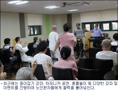 따라서 최근에는 노인과 재활환자들의 특성에 맞게 병실을 개선하는 등 시설과 운영에 대한 차별화를 두는 곳이 많아지고 있다. 웃음치료, 종이접기 강좌, 하모니카 공연, 풍물놀이 등 다양한 프로그램을 마련하여 가벼운 신체 움직임을 유도하고 두뇌에 긍정적인 자극을 전달하는 등 노인환자를 위해 다양한 프로그램이 실행되고 있다.
