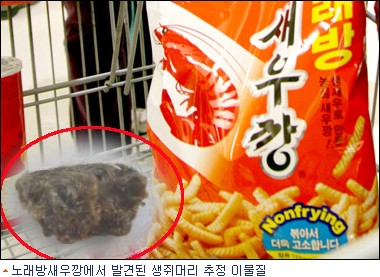 생쥐머리로 추정되는 이물질이 발견된 노래방 새우깡의 생산이 중단됐다.