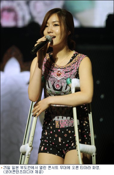 앞서, 화영의 논란이 처음 촉발된 것은 일본 투어 콘서트의 마지막인 일본 부도칸 공연때문이었다. 티아라는 7월 25일과 26일 이틀간 일본 부도칸에서 공연을 펼쳤다. 그런데, 이날 공연에는 막내 화영이 보이지 않았다. 멤버들은 화영의 다리 부상 사실을 알렸고, 화영은 깁스를 하고 목발을 짚은 채 무대 위에 등장해 팬들에게 사과의 말을 전하기도 했다.