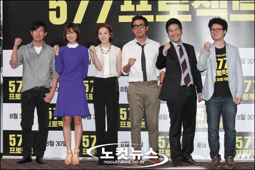 영화 '577 프로젝트' 언론시사회가 20일 오후 서울 행당동 왕십리 CGV에서 열린 가운데 감독과 배우들이 포토타임을 갖고 있다.사진왼쪽부터 배우, 강신철, 공효진, 이승하, 하정우, 한상천, 이근우 감독.