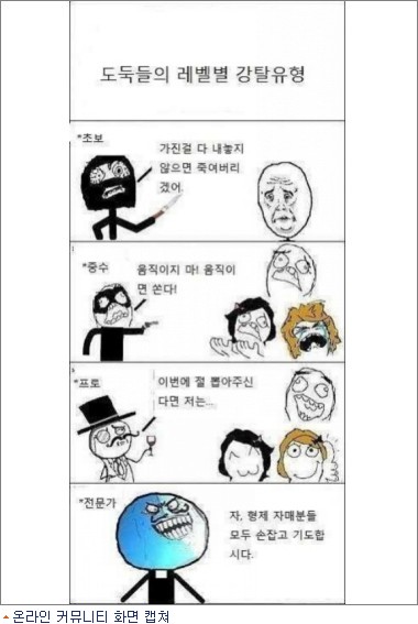 최근 온라인 커뮤니티에 ‘도둑들 레벨별 유형’이라는 제목의 짧은 게시물이 인기를 얻고 있다. 게시물은 네 컷의 짧은 만화로 구성됐다.