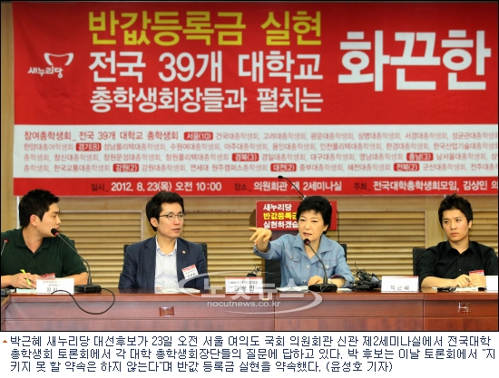 새누리당 박근혜 후보가 23일 '대학교 반값등록금' 정책실현 토론회에 참석해 "대학생 등록금 부담을 반드시 반으로 낮추겠다"고 밝혔다.