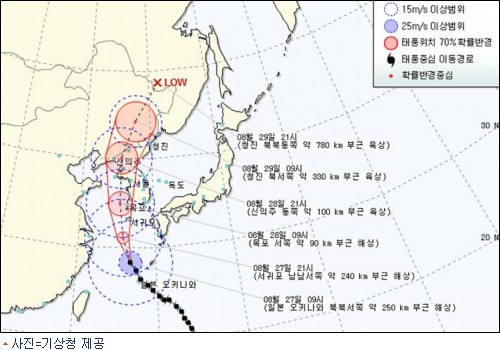 일본 오키나와를 강타한 제15호 태풍 볼라벤이 한반도를 향해 빠르게 북상하면서 27일 밤부터는 전국에 태풍 특보가 내려지겠고 제주는 28일 새벽 3시, 서울은 같은날 오후 2시가 최대 고비가 될 전망이다.
