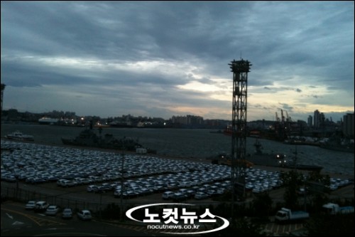 9시 현재 국제여객항인 평택항에는 강한 바람과 함께 파도가 일면서 정박중인 배들이 휘청거리고 있다.