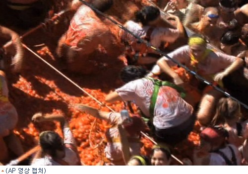 수만명이 스페인 작은 마을에 모여 대규모 토마토 던지기 축제를 벌였다고 29일 AP가 전했다.