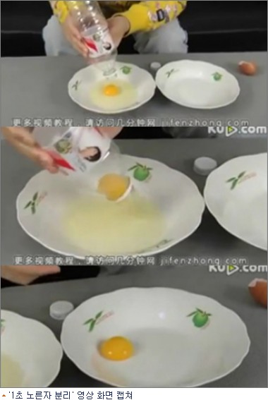이 영상은 한 중국인이 방송에서 생활의 지혜로 소개한 노른자 분리법을 담고 있다.