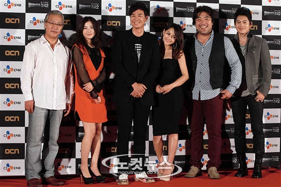 4일 오후 서울 성산동 상암CGV에서 진행된 OCN TV시리즈 ‘뱀파이어 검사2’ 제작발표회에서 (왼쪽부터)이경영, 요시타카 유리코, 연정훈, 이영아, 이원종, 김주영이 취재진을 향해 포즈를 취하고 있다.