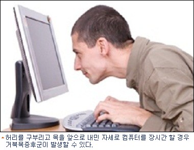 현대 직장인들은 주로 컴퓨터를 이용해 업무를 처리한다. 이때 자신도 모르는 사이에 허리를 구부리고 목을 앞으로 내민 자세로 모니터를 주시하는 경우가 많다. 이런 자세로 장시간 업무를 처리하게 되면 뒷목의 인대와 근육이 늘어나면서 만성적인 통증이 발생할 수 있고 심한 경우 거북목증후군이 될 수 있다.