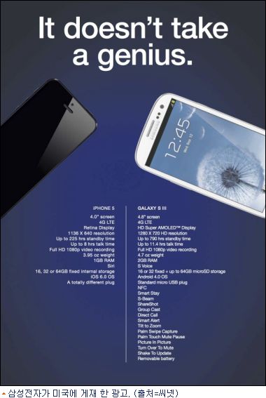 "It doesn't take a genius"(그리 어렵지 않아요)라는 문장으로 시작하는 이 광고에는 갤럭시S3와 애플 아이폰5의 사진과 기능등이 열거 되어 있다.