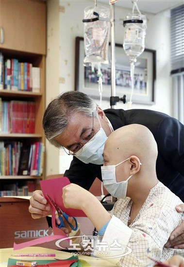 민주통합당 문재인 대선후보가 9일 오후 서울 풍납동 아산병원 소아암병동을 방문해 미술수업중인 아이들과 얘기 나누고 있다.