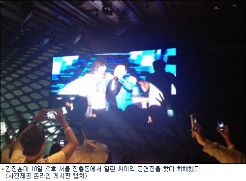 싸이는 10일 오후 서울 장충동 신라호텔에서 열린 메르세데스 AMG 페트로나스 F1팀 행사인 ‘나이트 오브 더 스타스(Night of the Stars) 2012’ 무대에 올라 공연을 펼쳤다. 여기에 김장훈이 깜짝 등장해 화해의 말을 전했다.