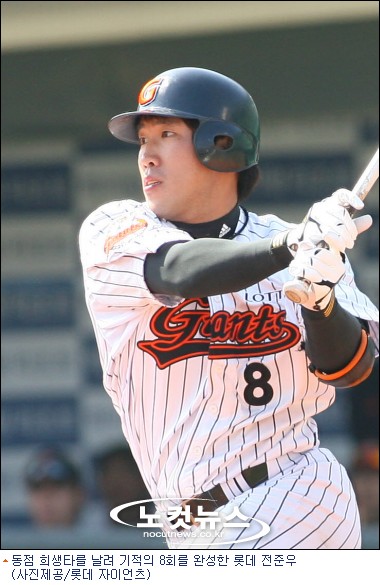 전준우는 풀카운트 접전 끝에 우측 멀리 공을 날렸다. 동점 희생플라이. 그 사이 3루주자 손아섭이 홈을 밟아 승부는 3-3, 극적인 동점이 됐다.