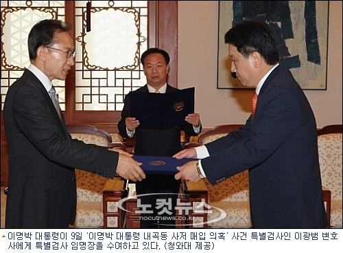 이명박 대통령의 내곡동 사저부지 매입 의혹을 수사할 이광범 특별검사팀이 15일 오전 개청식을 열고 공식 출범했다. 향후 최장 45일간의 수사에서 이 대통령 아들 시형씨 등 사건 관계자의 줄소환이 예상된다.