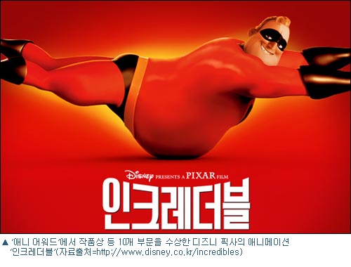 ''니모를 찾아서''를 제작한 디즈니 픽사의 야심작 ''인크레더블''은 오는 2월 27일 열리는 제 77회 아카데미 시상식에서도 최우수 애니메이션 후보작에도 올라 수상이 기대되는 기대작이다.