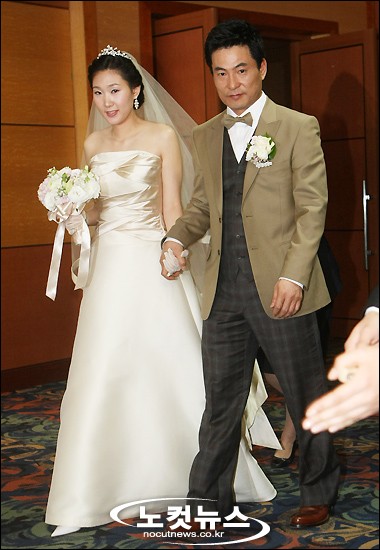 [BestNocut_R]19살 연하의 최혜경씨(30)와 늦깍이 결혼식을 올리는 연기자 이한위(49)가 21일 오후 서울 잠원동 센트럴시티 밀레니엄홀에서 열릴 결혼식에 앞서 웨딩드레스를 차려 입은 신부와 함께 모습을 드러내고 있다.