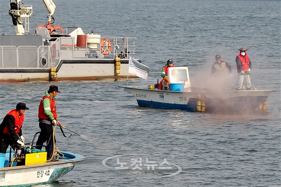서울시 한강사업본부가 30일 오후 서울 여의도 한강공원 인근에서 조류(녹조) 발생에 따른 녹조류 피해를 최소화하기 위한 현장대응 방제훈련을 하고 있다. 이번 훈련은 조류경보 발생대비 선박을 이용해 물위에 부상한 조류를 분산시키는 플러싱(뭉쳐있는 조류를 분산시키는 작업)과 물대포 등을 훈련한다.