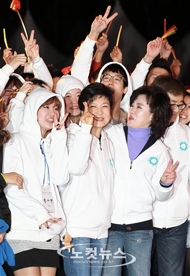 새누리당 박근혜 대선후보가 31일 오후 서울 광화문 광장에서 열린 ‘청년들이 바라는 지도자-청바지 쇼’ 에 참석해 참석자들과 기념촬영 하고 있다.
