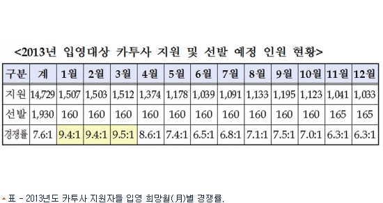 병무청은 5일 “2013년도 카투사 지원자들의 입영 희망월(月)을 분석한 결과 1월에서 3월이 9.4대1에서 9.5대1로 나타났으며, 3월이 9.5대1로 가장 높은 경쟁률을 보였다”고 밝혔다.