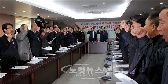20일 오전 서울 서초구 방배동 전국버스회관에서 전국버스운송사업연합회와 전국자동차노동조합 연맹이 공동으로 긴급비상대책회의를 개최해 택시를 대중교통수단에 포함하는 대중교통의 육성 및 이용촉진에 관한 법률의 철회를 촉구하는 결의문을 채택하고 구호를 외치고 있다.