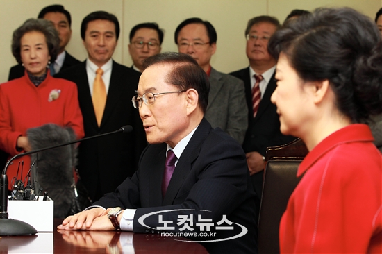 새누리당 박근혜 대선후보를 지지선언한 자유선진당 이회창 前총재가 24일 오전 서울 여의도 새누리당사에서 기자회견 전 박근혜 후보와 환담나누고 있다.