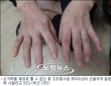 최 씨는 "허리에 파스를 늘 붙이고 산다"며 "하루에도 수 천 번 수저를 쥐었다폈다 하다보니 평상시에도 손가락을 제대로 펼 수 없다"고 하소연했다.