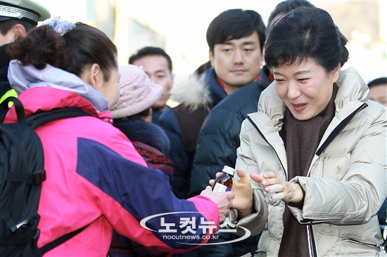 제18대 대통령 선거를 20일 앞둔 29일 오후 인천시 석남동 거북시장을 찾은 새누리당 박근혜 대선후보가 한 시민으로부터 자양강장제를 받고 있다.