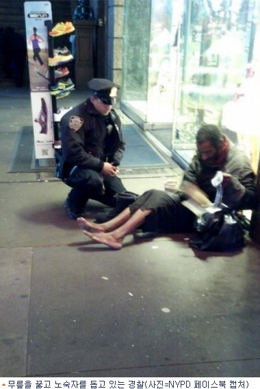 추운 밤 맨발로 구걸을 하는 노숙자에게 젊은 경찰관이 다가가 따뜻한 부츠를 선물했던 것.